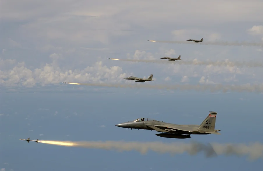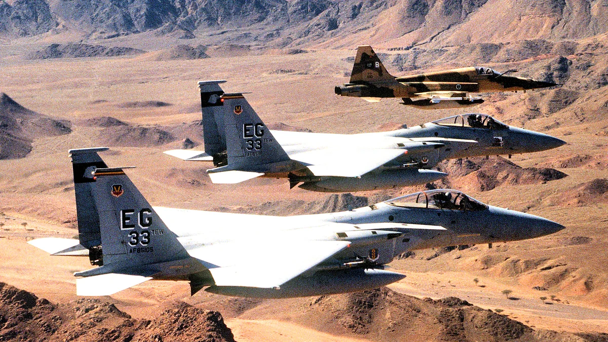 Para samolotów F-15C należących do 33. Tactical Fighter Wing, w towarzystwie saudyjskiego myśliwca Northrop F-5E Tiger II.
